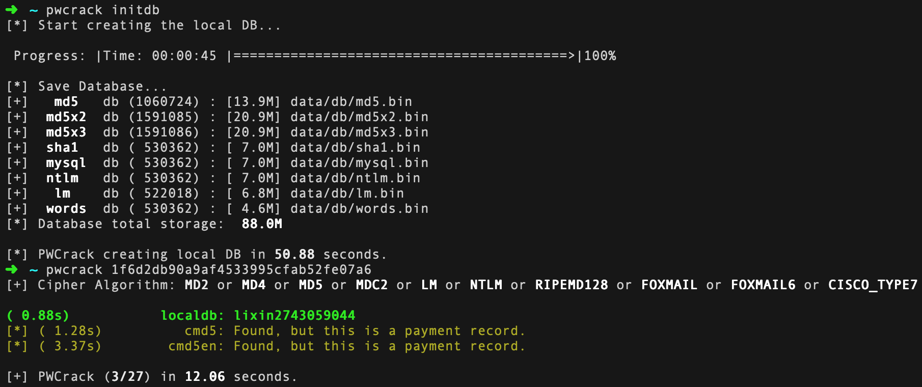 $ pwcrack updatedb- 遇到收费的password也可以提交Issues,共同完善localdb