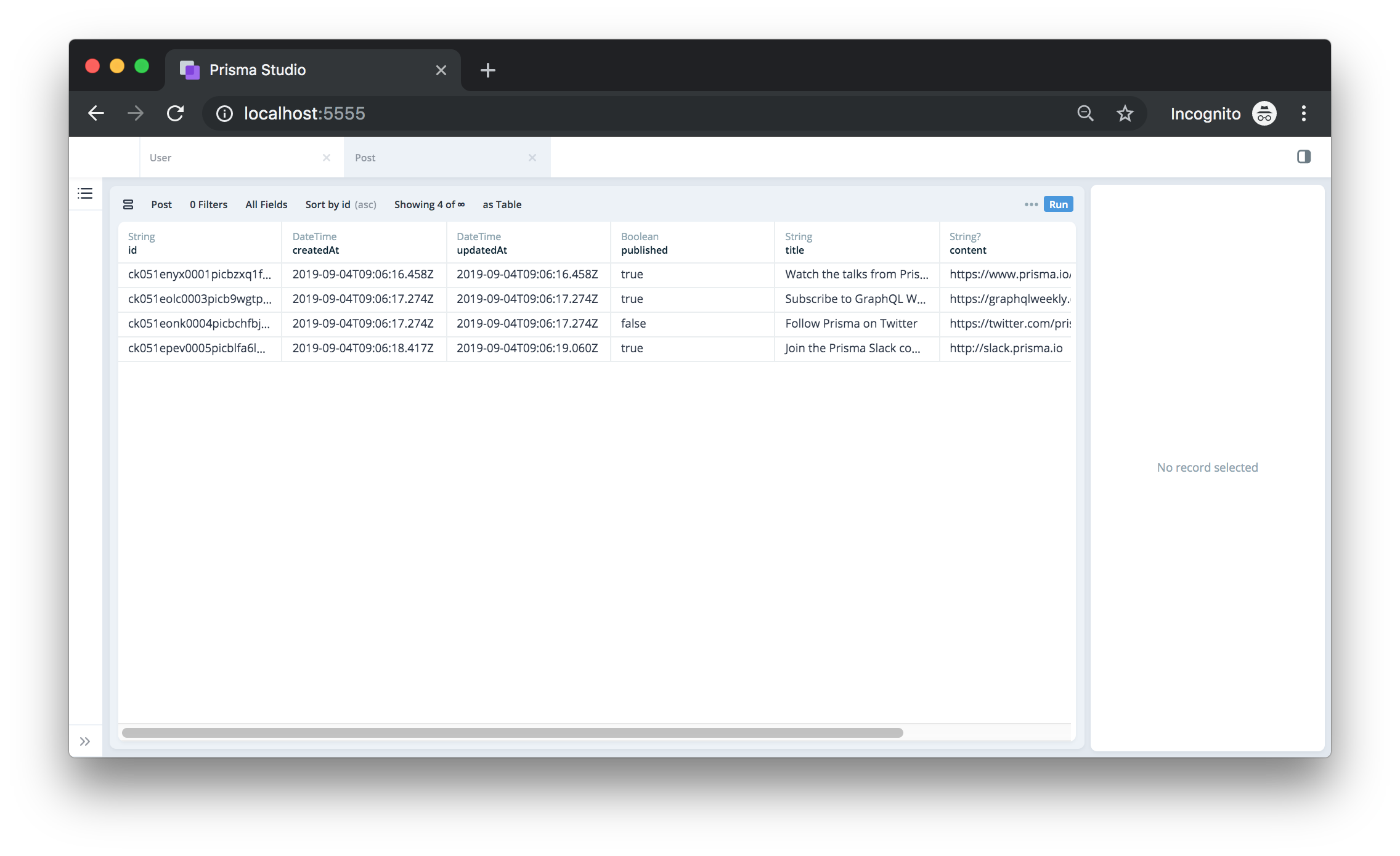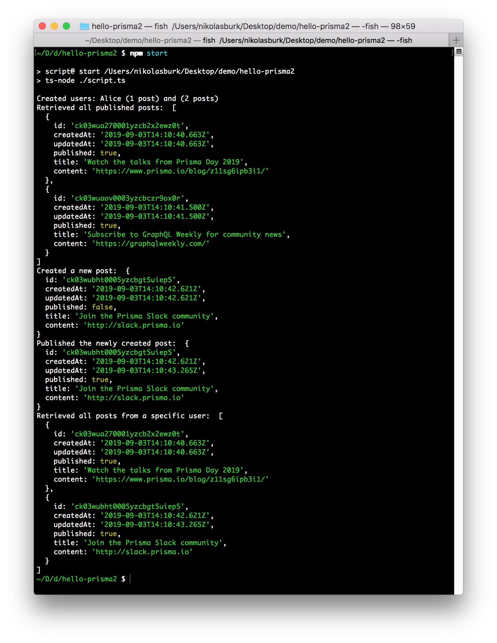 photon.users.create(...)- Alice has one post titled Watch the talks from Prisma Day 2019