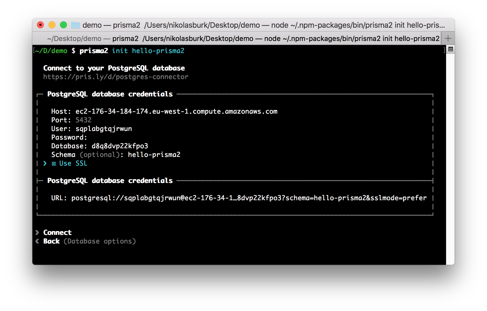url = "postgresql://opnmyfngbknppm:XXX@ec2-46-137-91-216.eu-west-1.compute.amazonaws.com:5432/d50rgmkqi2ipus?schema=hello-prisma2"