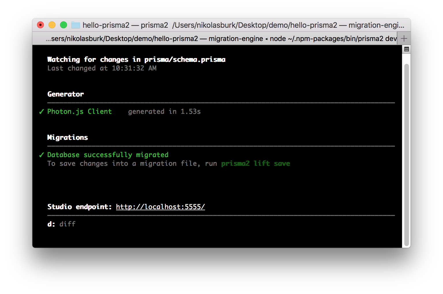 + }Be sure to save the file. As you save it, you can observe your terminal window to see Prisma's activity: