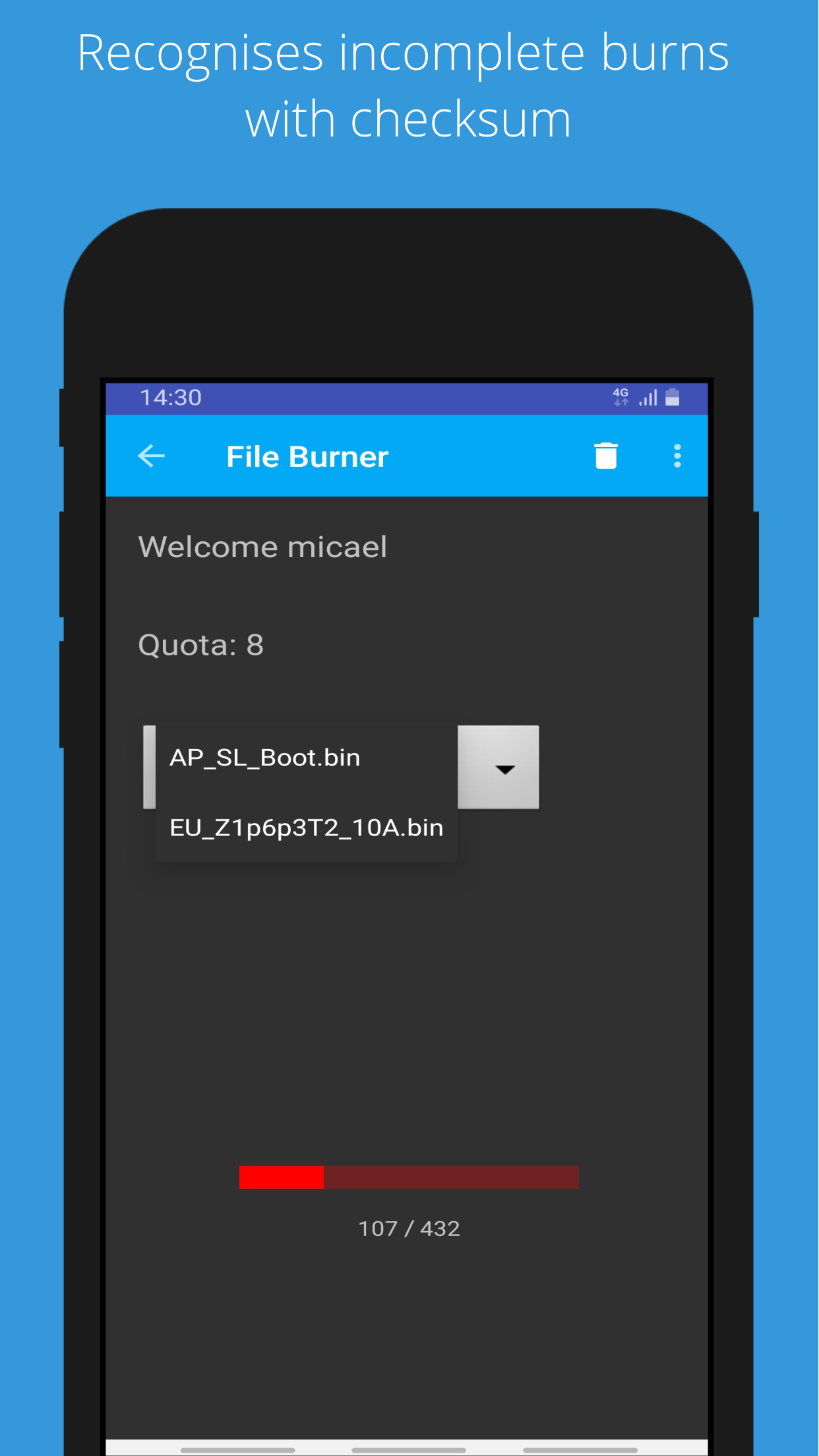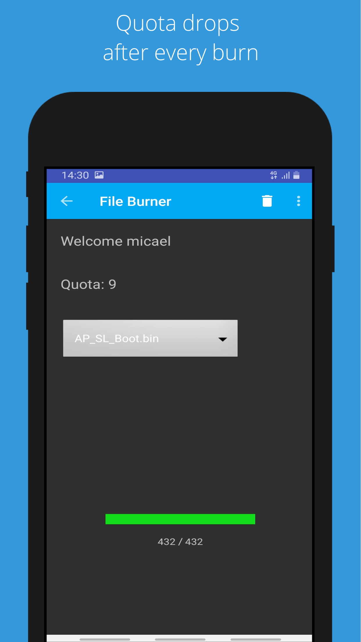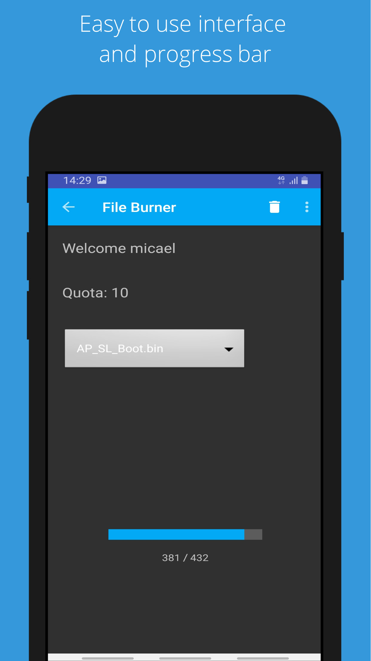 This is an elegant File burner app which intergrates with a complete backend system that lets you add files to burn remotely with user authentication and with and user quota management. All files are burnt using the XMODEM crc-16 protocol and use of Gecko Bootloader.