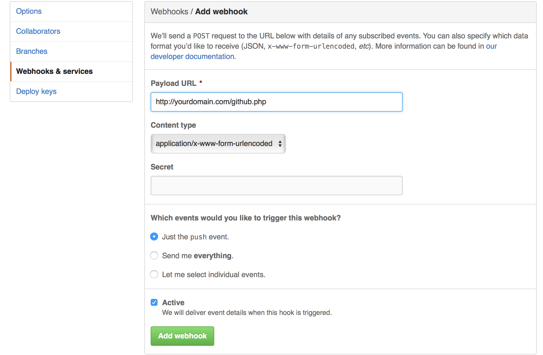 Copy github.php and github.config.php to the base of your checked out code on your server. These scripts need to be accessible by an HTTP POST.
