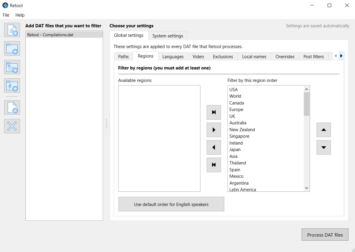 You add your DAT files to Retool, and it creates new DAT files with all your preferences, leaving the originals intact. You can then load the new DAT files in a ROM manager like RomVault, CLRMamePro, or IGIR to do your file management — you just don't need to use their 1G1R modes, as Retool has already done the work for you.
